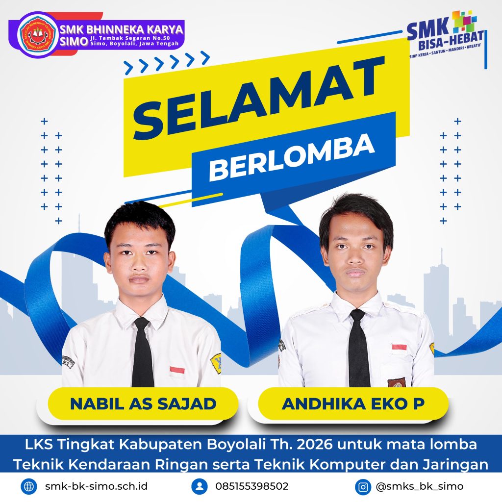 SMK Bhinneka Karya Simo, Mengirimkan Perwakilan Siswa Terbaik di ajang Lomba Kompetensi Siswa (LKS) Tingkat Kabupaten Boyolali Tahun 2026 untuk Lomba Teknik Kendaraan Ringan, Teknik Komputer dan Jaringan dan Teknik Sepeda Motor yang dilaksanakan pada hari Rabu & Kamis Tanggal 11-12 Februari 2026. Yang diwakili oleh : Lomba Kompetensi Siswa (LKS) adalah kompetensi tahunan antar […]