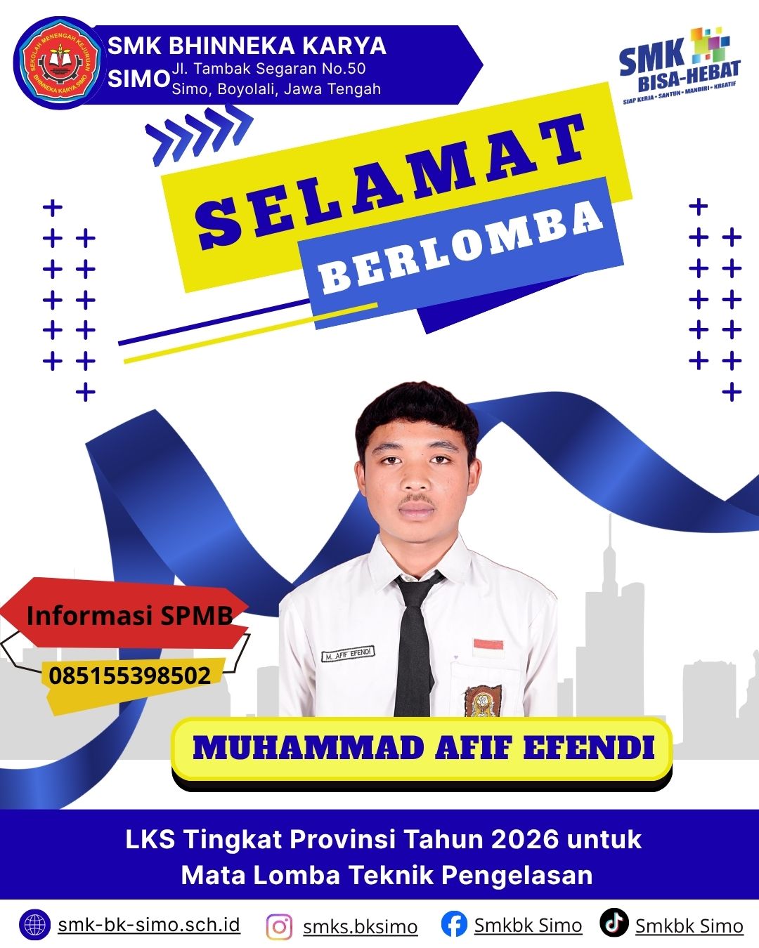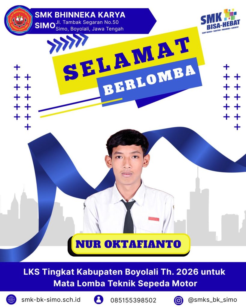 SMK Bhinneka Karya Simo, Mengirimkan Perwakilan Siswa Terbaik di ajang Lomba Kompetensi Siswa (LKS) Tingkat Kabupaten Boyolali Tahun 2026 untuk Lomba Teknik Kendaraan Ringan, Teknik Komputer dan Jaringan dan Teknik Sepeda Motor yang dilaksanakan pada hari Rabu & Kamis Tanggal 11-12 Februari 2026.