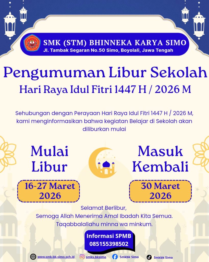 Sehubungan dengan Perayaan Hari Raya Idul Fitri 1447 H / 2026 M, Kami Menginformasikan bahwa kegiatan belajar di Sekolah akan diliburkan Mulai Tanggal 16 – 27 Maret 2026. Masuk Kembali Tanggal 30 Maret 2026.