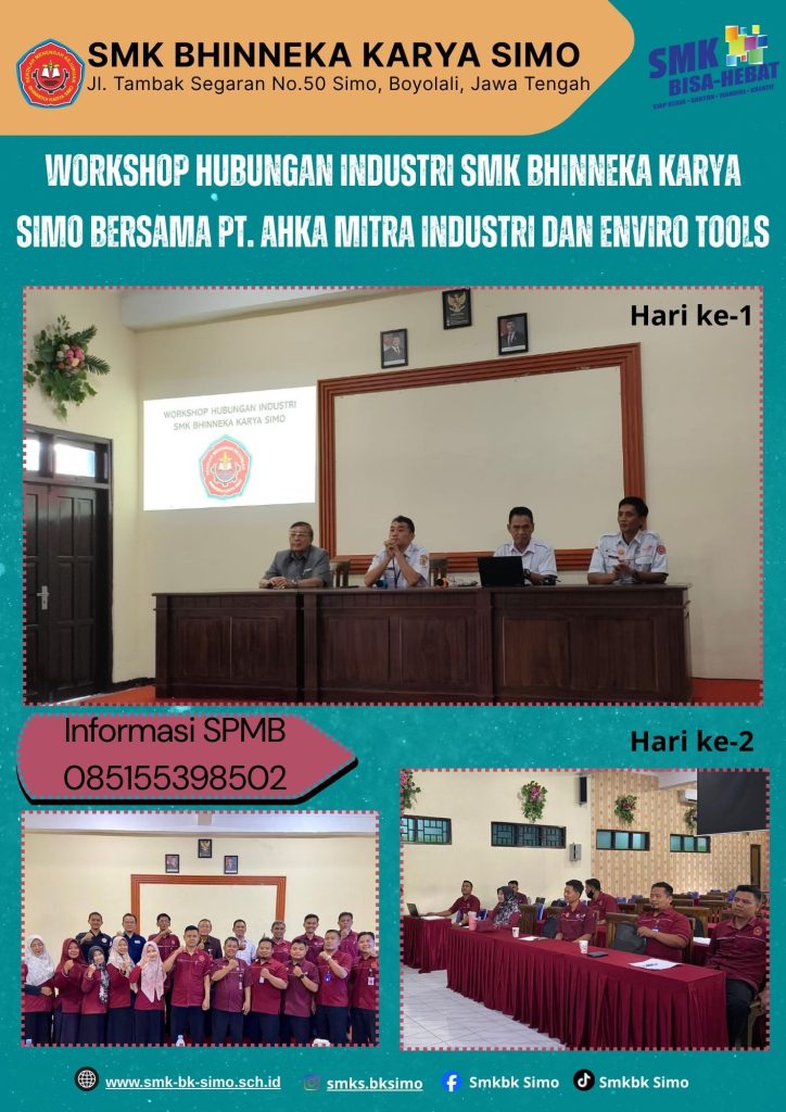 SMK Bhinneka Karya Simo melakukan Workshop hubungan industri bersama PT. AHKA Mitra Industri dan Enviro Tools pada Hari Rabu dan Kamis tanggal 8-9 April 2026 yang dihadiri oleh Bapak Drs. Suwarto selaku kepala sekolah SMK Bhinneka Karya Simo beserta Komite, Wakil Kepala Sekolah bidang Kurikulum, IT Sekolah, BKK beserta perwakilan dari bidang Tata Usaha.