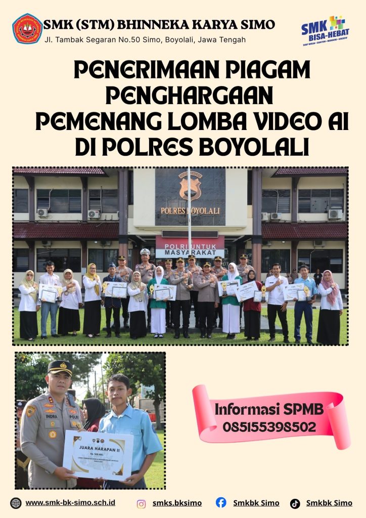 Rabu, 29 April 2026 SMK Bhinneka Karya Simo menghadiri penyerahan piagam penghargaan pemenang Juara Harapan 2 Lomba video AI di Polres Boyolali. Sekali lagi, selamat dan sukses untuk ananda Muh. Rehan Alfandi (Kelas XI.5) atas Prestasi yang membanggakan. Semoga Prestasi ini dapat dipertahankan dan terus ditingkatkan, serta dapat menjadi inspirasi bagi siswa siswi yang lain […]