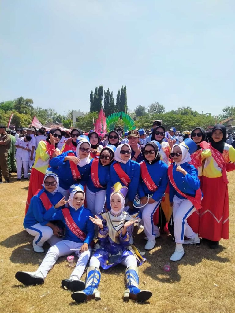Foto kegiatan memperlihatkan anggota drum band bersama pendamping berkumpul setelah penampilan, dengan suasana gembira serta kebersamaan yang kuat. Energi positif tersebut mencerminkan soliditas dan kerja keras tim selama persiapan kegiatan.